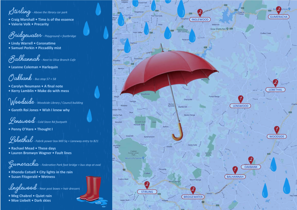 My poem, coronatime, was stencilled onto a path in the Bridgewater Park as part of this year’s Raining Poetry in the Hills project, an adjunct to Raining Poetry in Adelaide who stencilled my 2018 poem onto a city street.
