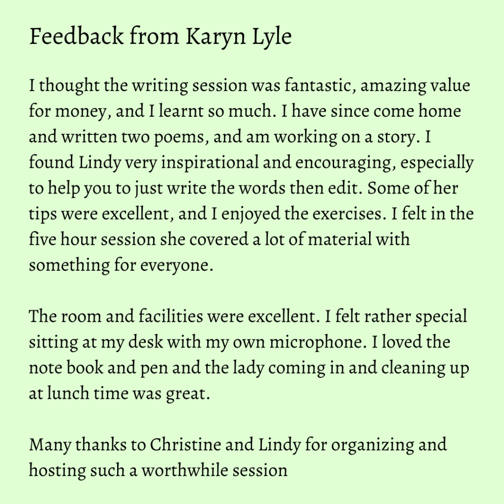 Holdfast Bay Libraries invited me to offer an all-day writing workshop at the Brighton Civic Centre in September 2022. It was well attended and received. I thank Christine Kennedy of the Glenelg and Brighton Libraries for hosting the occasion in the wonderful Kingston Room.