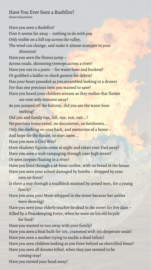 I discovered Ranjan Abayasekera’s poem ‘Have You Seen a Bushfire’ in Another Country, a Sydney PEN anthology edited by Rosie Scott and Thomas Keneally (1984). The writings are primarily from refugees held in the Baxter Detention Centre. The Introduction reads —