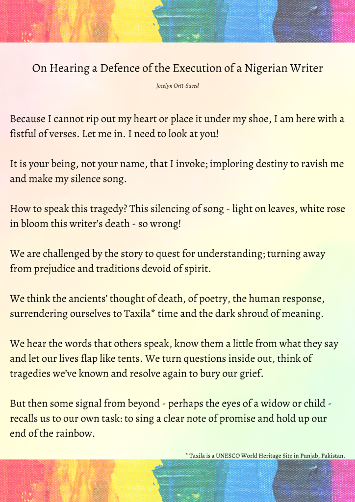 Dr Judith Buckrich, Vice-President of the Melbourne Centre of PEN in Australia until 2017 and Chair of IPWWC between 2003 and 2009 introduced me to PEN and provided the following poem by Jocelyn Ortt-Saeed.