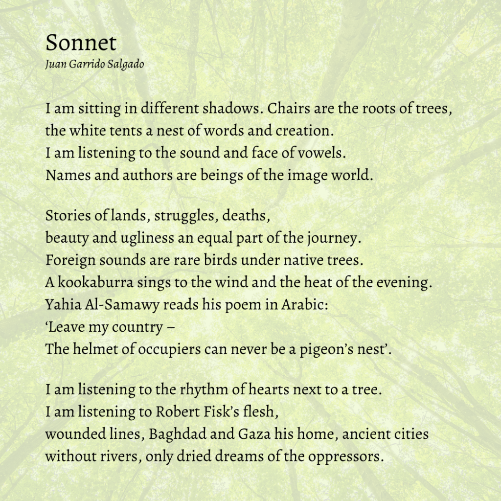 In 2019, Juan read poems from his book, When I was Clandestine as part of a poetical tour at the Granada International Poetry Festival in Nicaragua and at a series of literary events in Mexico and Cuba. His most recent collection is Hope Blossoming in their Ink. (Puncher & Wattmann 2020).