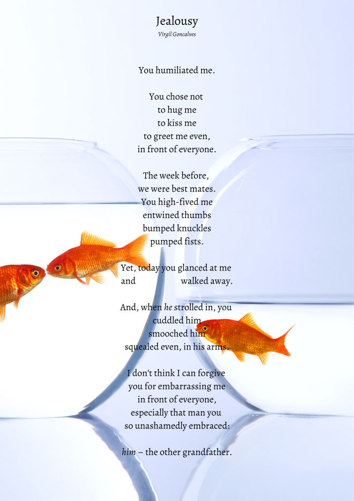 I have an affinity for short stories but, in latter years, have become besotted by the art of writing poems. Iโve tried all sorts โ haiku, sonnet, villanelle โ but felt most at ease with free verse, especially toying with various structures and last lines which try to startle. Iโve become fond of quirky. Using fodder from playtime with my first grandchild prompted me to write this poem.