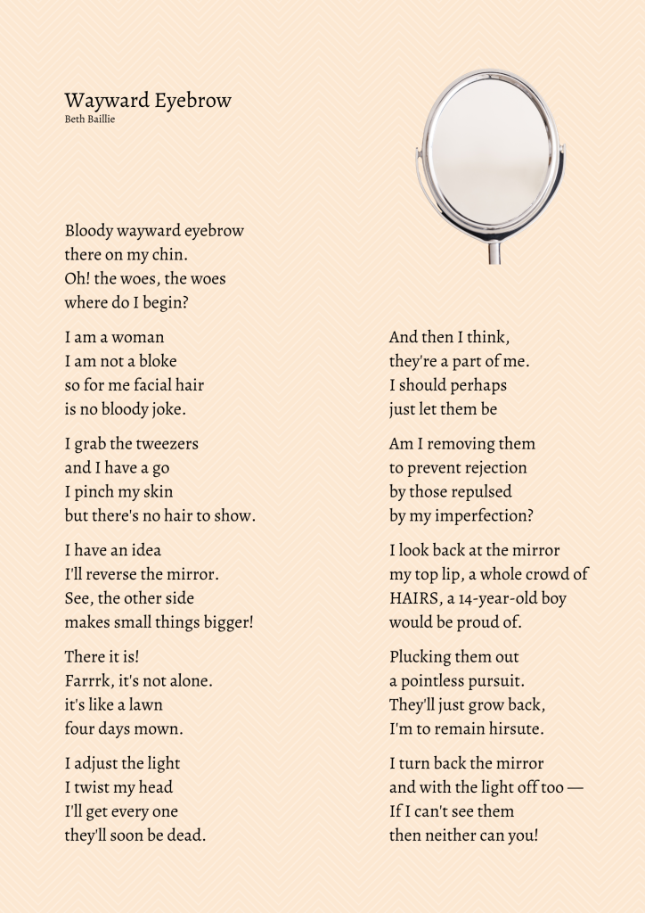 I’ll end this section with the following poem because, although I am speaking up (sic) against my father, I want also to honour him for the love he showed me. He was a kind man, yet, like us all, a product of his times. I am simply drawing attention to the fact that some things haven’t changed. We have not scrutinized the sort of jocular teasing women put up with, even though it makes a statement about how a woman should behave or become.
