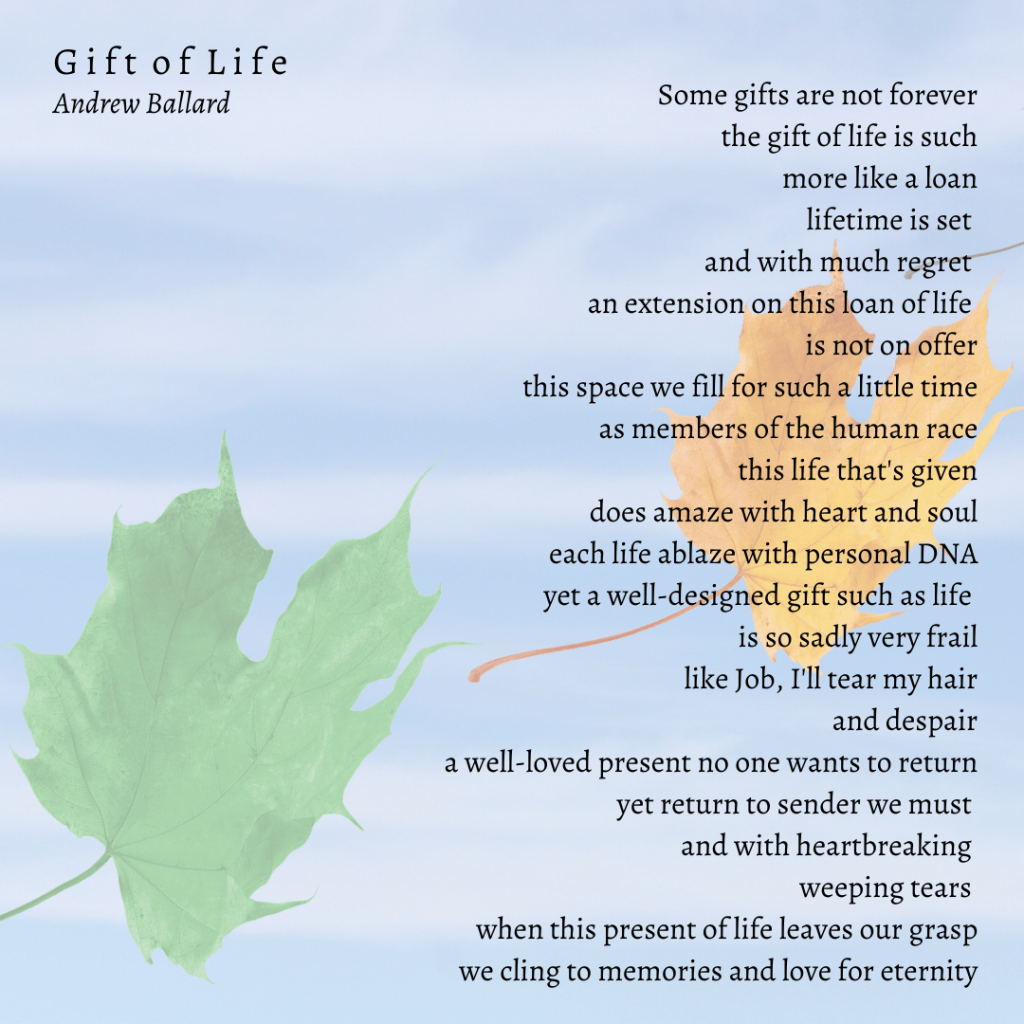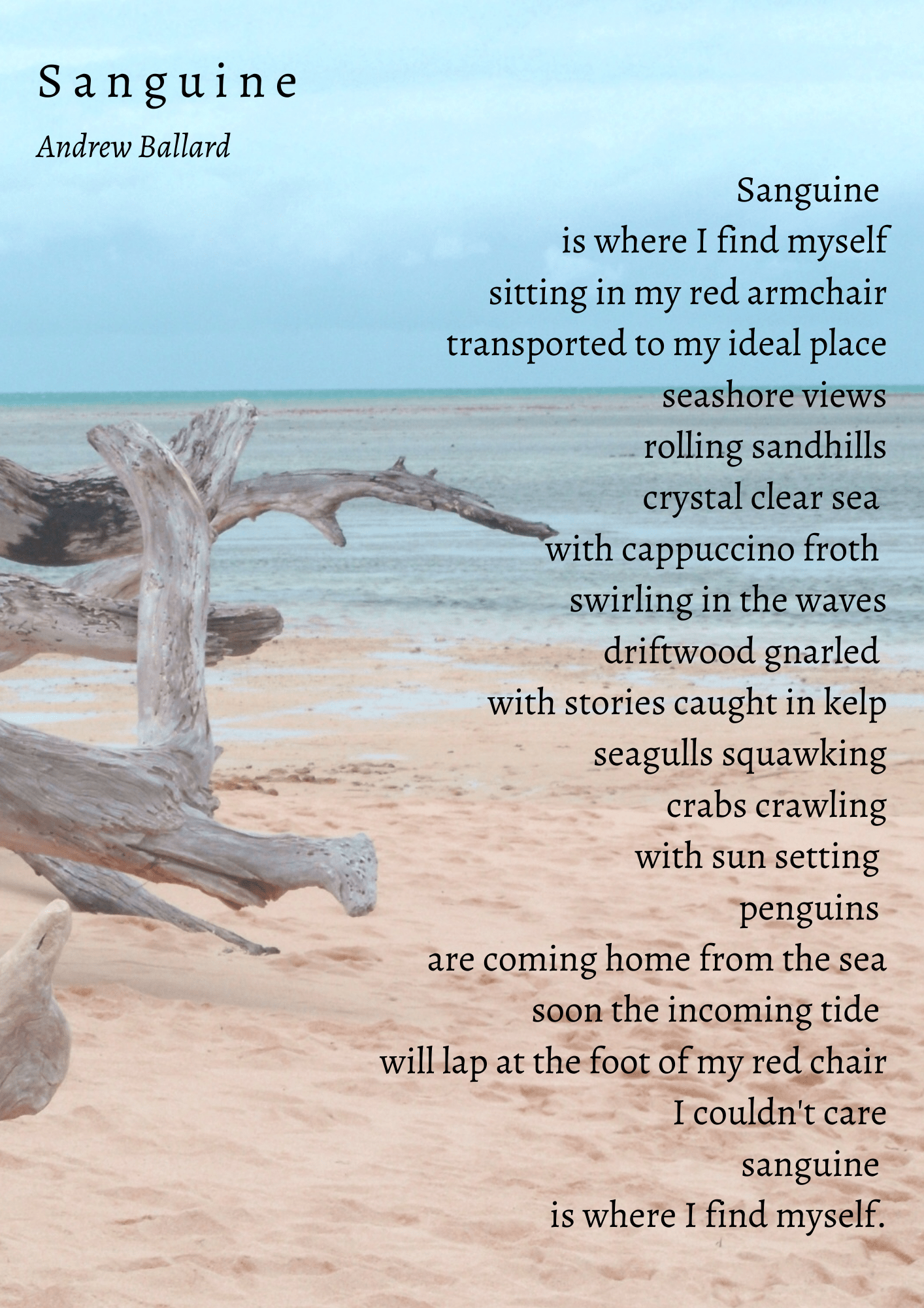 Andrew Ballard lives in Adelaide. He was a Petty Officer Medical in the Royal Australian Navy for 11 years. He worked for medical companies selling devices and instruments, then as a support worker in mental health and first aid and aged care trainer. Diagnosed with Systemic Macrocytosis, he took early retirement. In 2020, with activities curtailed, Andrew turned to writing and digital art. He has published In quick succession, in the US in the inaugural edition of the New Jersey Mignolo Arts Group’s journal, the New York poetry journal ‘Open Skies’, The Beckindale Poetry Journal and InDaily, Poets Corner.