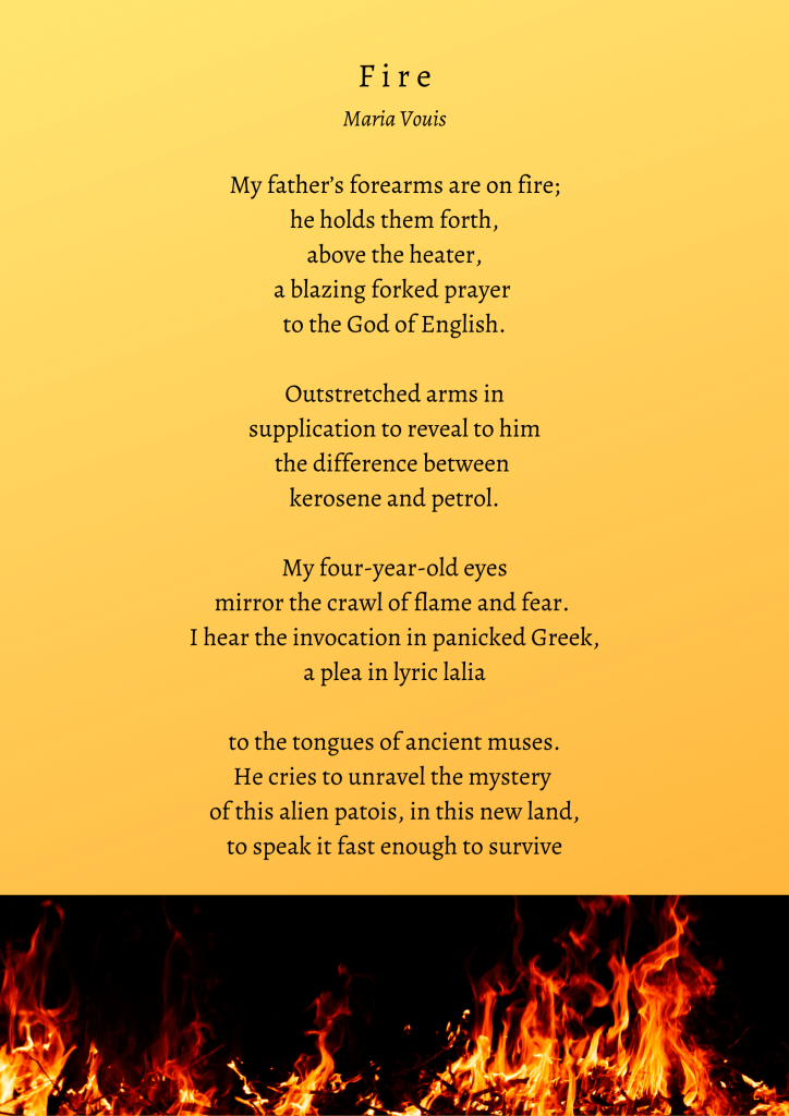 School classified me as ‘English-less’, which was a shock at five years of age. However, I graduated with the Year 12 English prize and have written mainly in English since. I gravitated towards creative writing and drama and was always the top performer in most English classes. Sadly, my Greek language is now much weaker than English, an expected loss for migrant children.