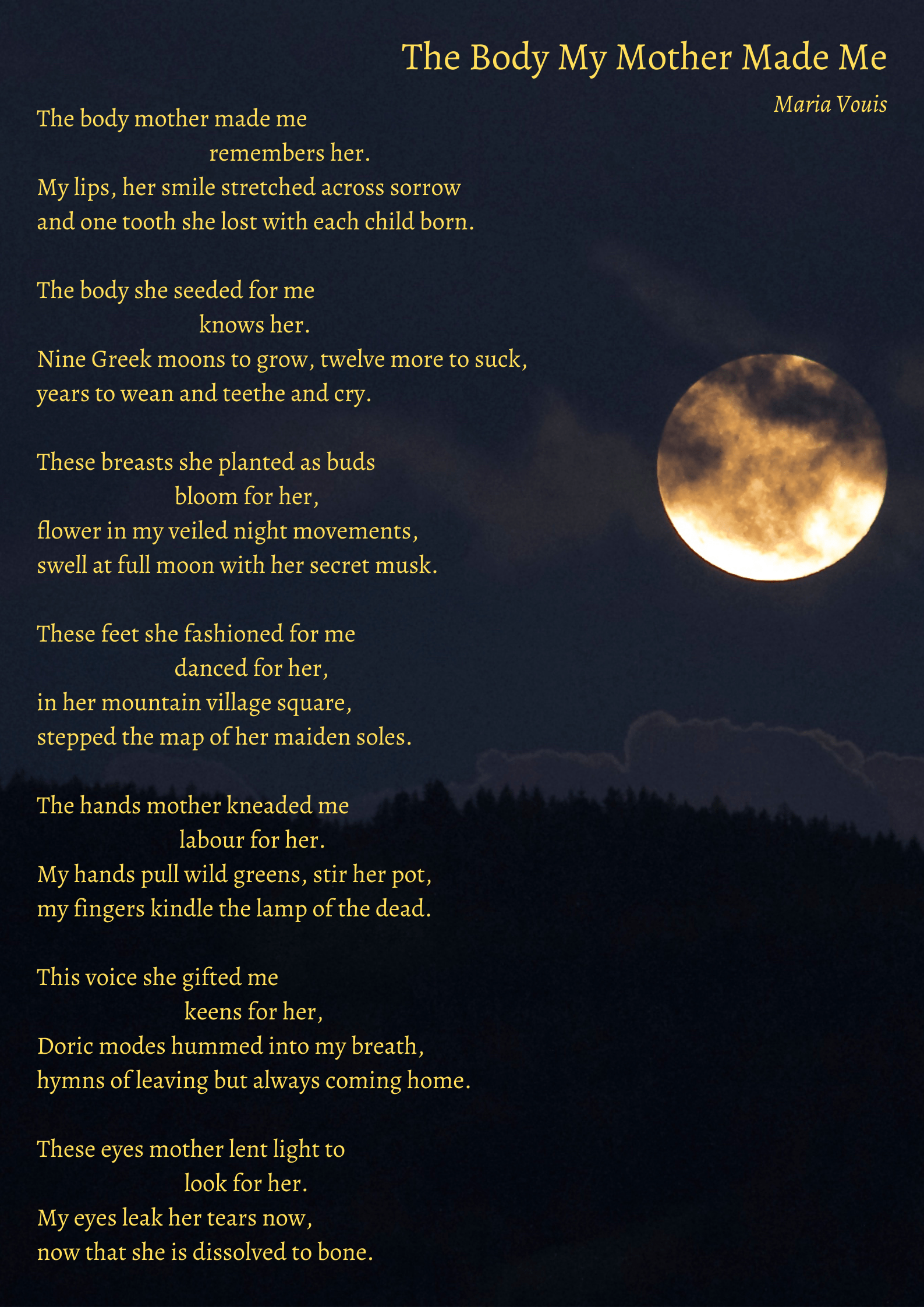 Maria is a child migrant. The schism of a two-tongue world fuels her poems. Maria is polishing her manuscripts Two Tongue World and Dogolalia, bothering editors, publishers, and literary friends alike.