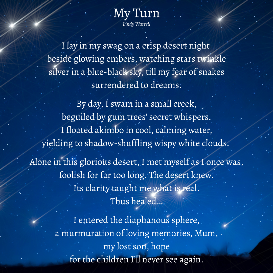 My Turn is something of a contemplative dream sequence predicated on my love for and experience of camping in the outback, often when working with First Nations people on their country. How could anyone forget such a privilege?