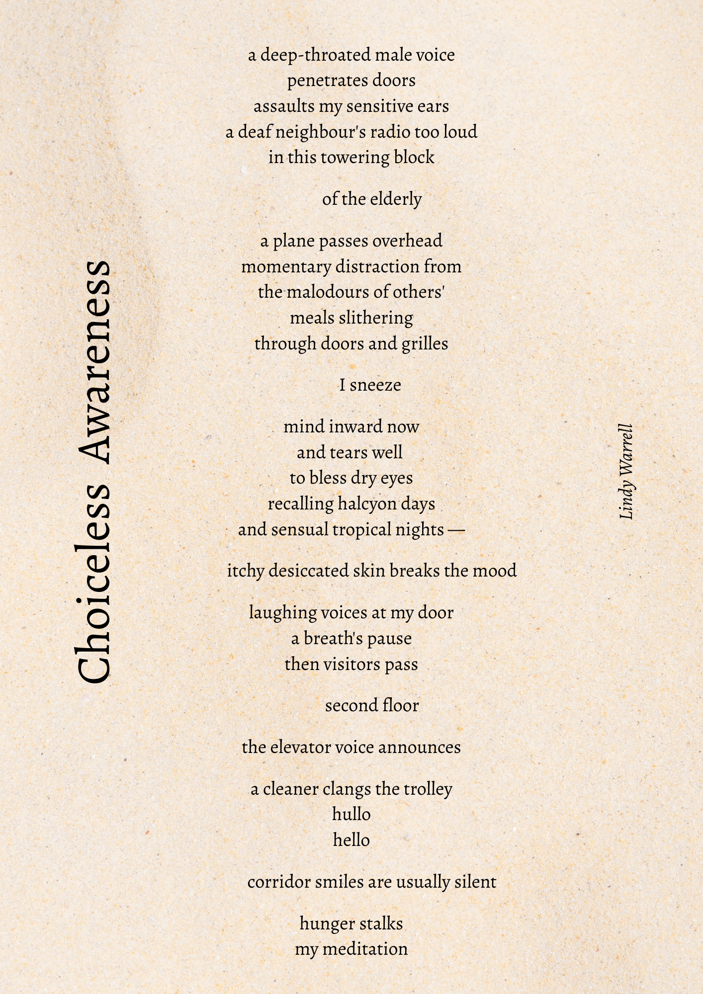 This first poem came from my meditative ponderings on living in a high-rise retirement unit that was built before soundproofing became a thing. It reminds me of old hotels in George Street and Chinatown in Sydney, many, many years ago. You didn’t need a glass to the wall to hear what was going on next door or anywhere else, for that matter. Even pipes creaked.