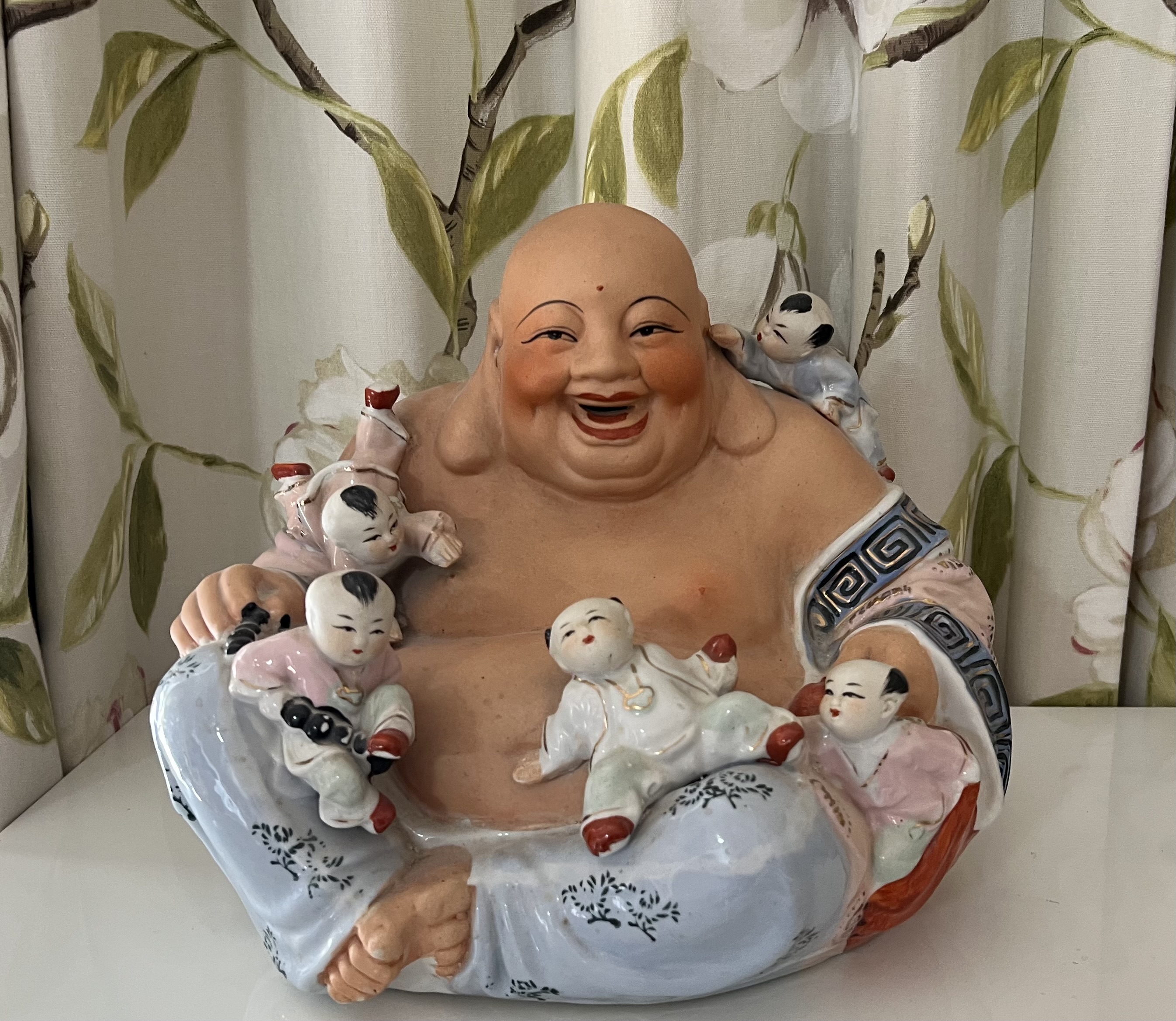 Looking back, I fell in love with it, not because it sort of reminded me of my second husband’s desertion, but because this rotund Chinese laughing Buddha in blue robes has five little children crawling all over his bare shoulders, a profound symbol of the love and joy I felt for my three young children. At the time, I had not discovered Buddhism; my choice was both aesthetic and emotional.