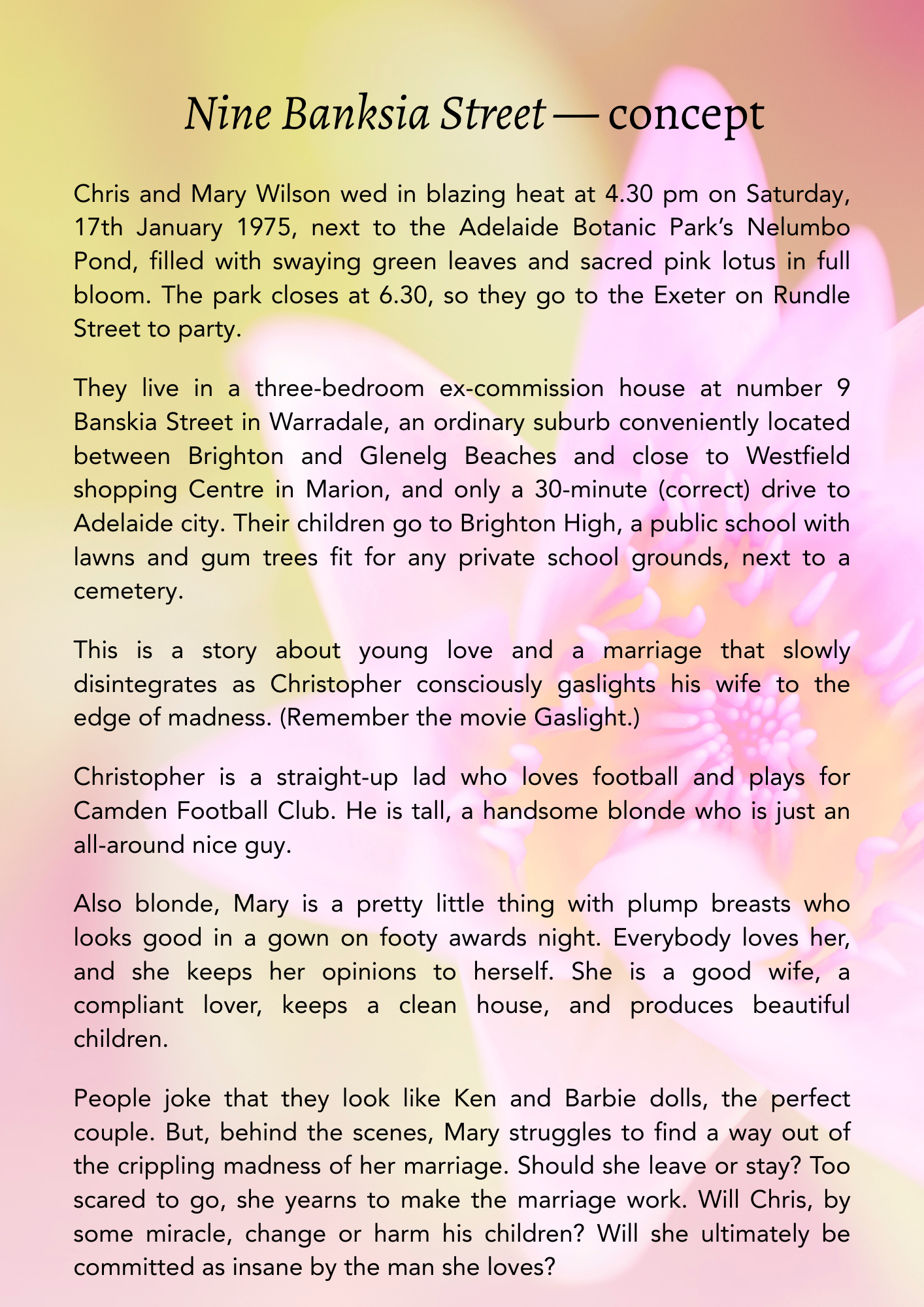 My gaslighting book’s working title is Nine Banksia Street. The main characters appeared in my mind simultaneously with the basic story concept, which came to me in a sandpit rush, pretty much word for word, as below. The story entices but remains unwritten for the time being.