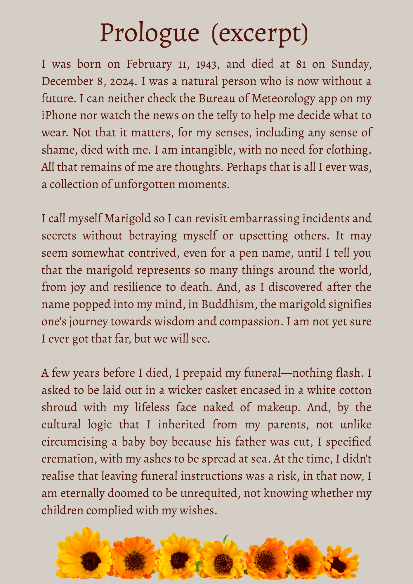 I can’t remember for the life of me (sic) why I chose to write anything resembling a memoir, but my work in progress, entitled Call Me Marigold, is a novella-length piece I’m calling autofiction until someone corrects me. The only way I could think of to tackle this material was to unsettle the protagonist as a posthumous narrator, an 81-year-old woman who could not rest in death until she understood life.