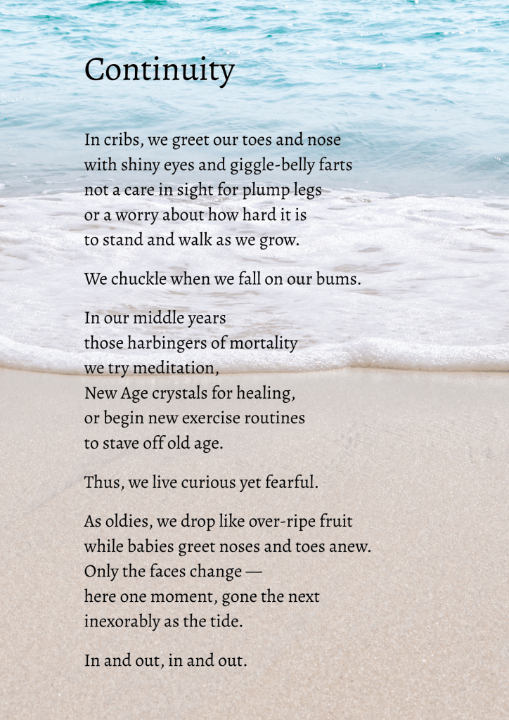 I started writing poems when I learned that poetry didn’t have to be flowery and rhyming but could be a conduit to tell a tale. The floodgates opened, and in just one year, I wrote over two hundred poems.