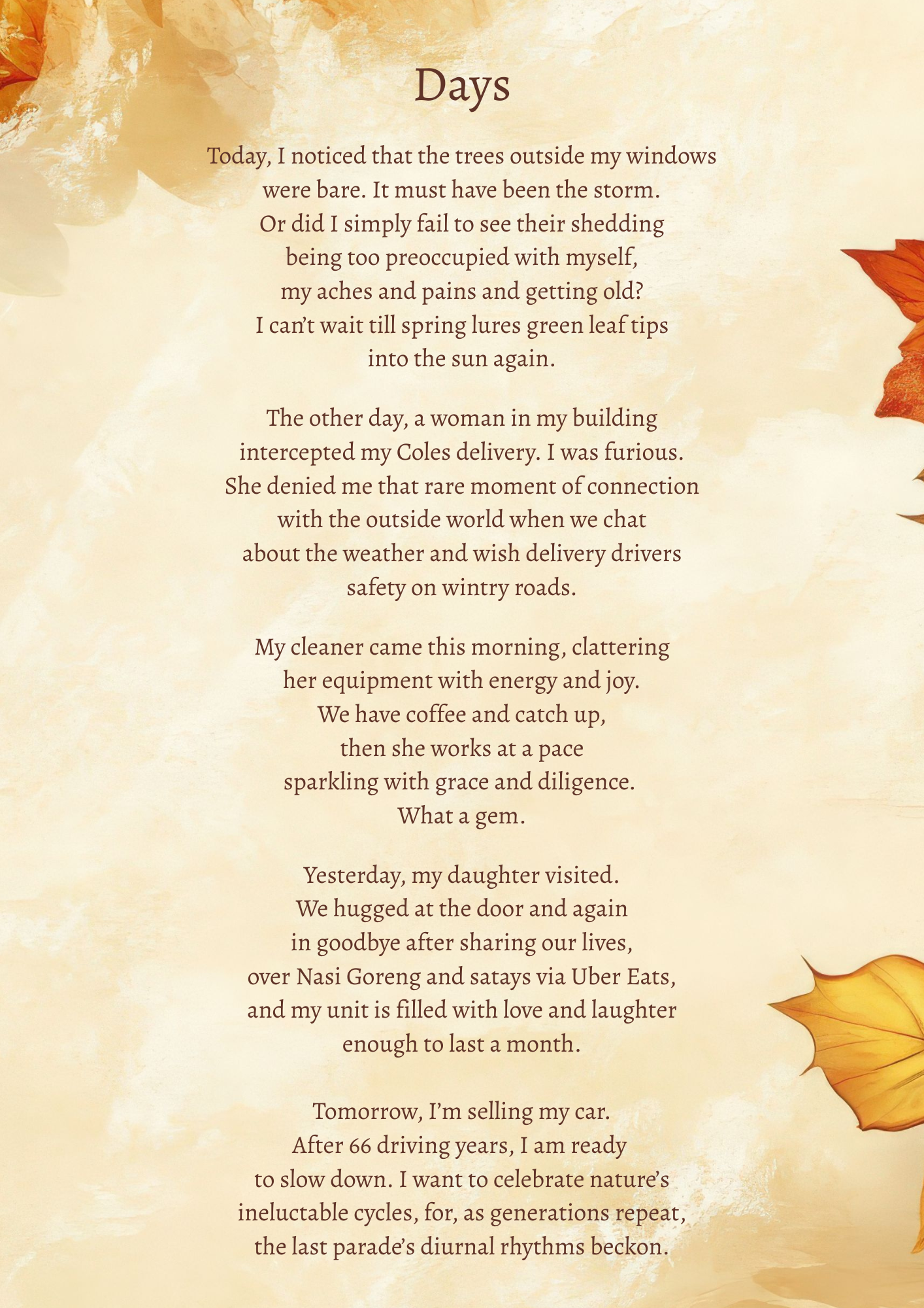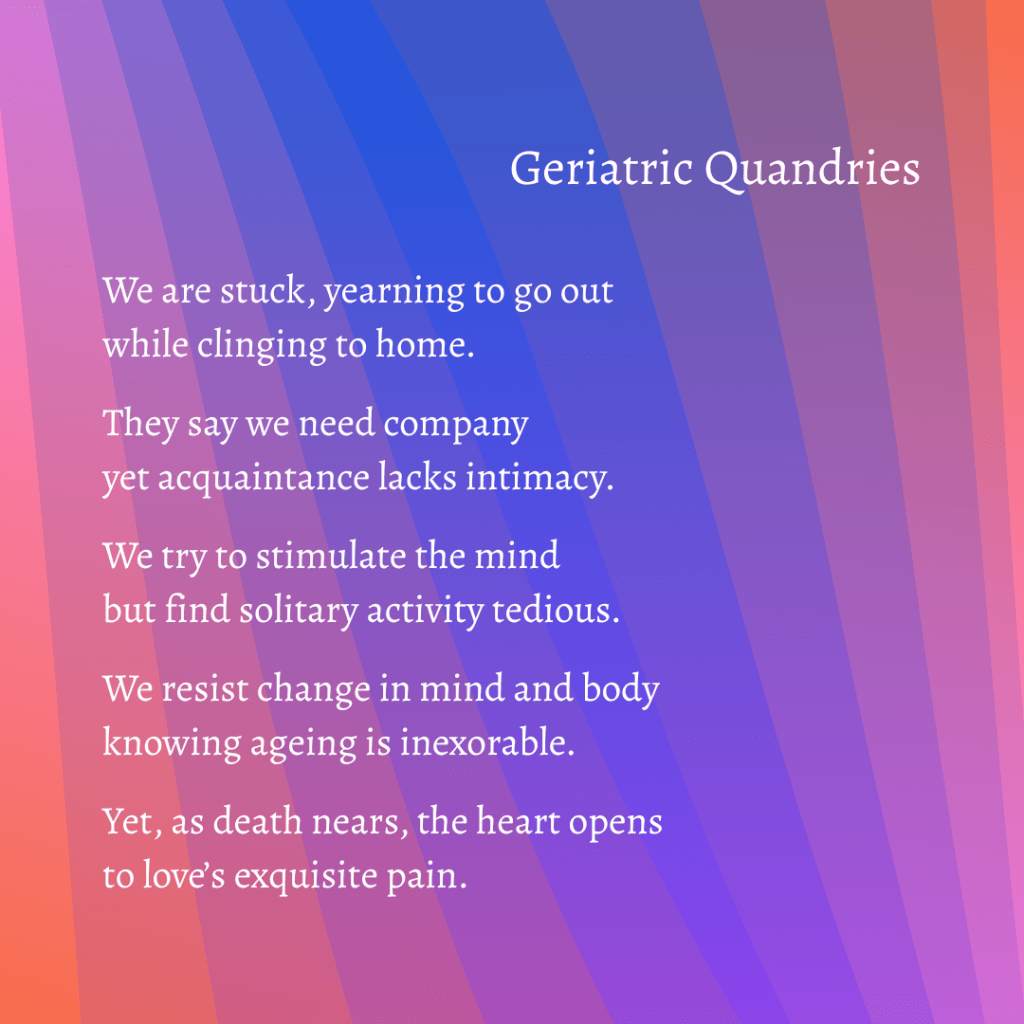 Between 2019 and 2020, I conceived the idea of poetry as a Life Writing project for seniors. The seed for this came through many fruitful conversations with Dr Lindy Warrell, who successfully ran Life Writing workshops in her local community.