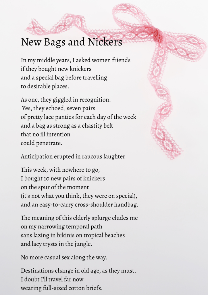 Lately, I seem to write a lot about ageing and old age. It makes me wonder if I’ve exhausted my earlier life as a source of ideas or whether, indeed, old age brings the focus home to the body in ways that others might only experience during illness. Old age may not be a sickness, but it is the gradual breakdown of one’s body, which increasingly demands more attention and time. It certainly brings focus into the now.