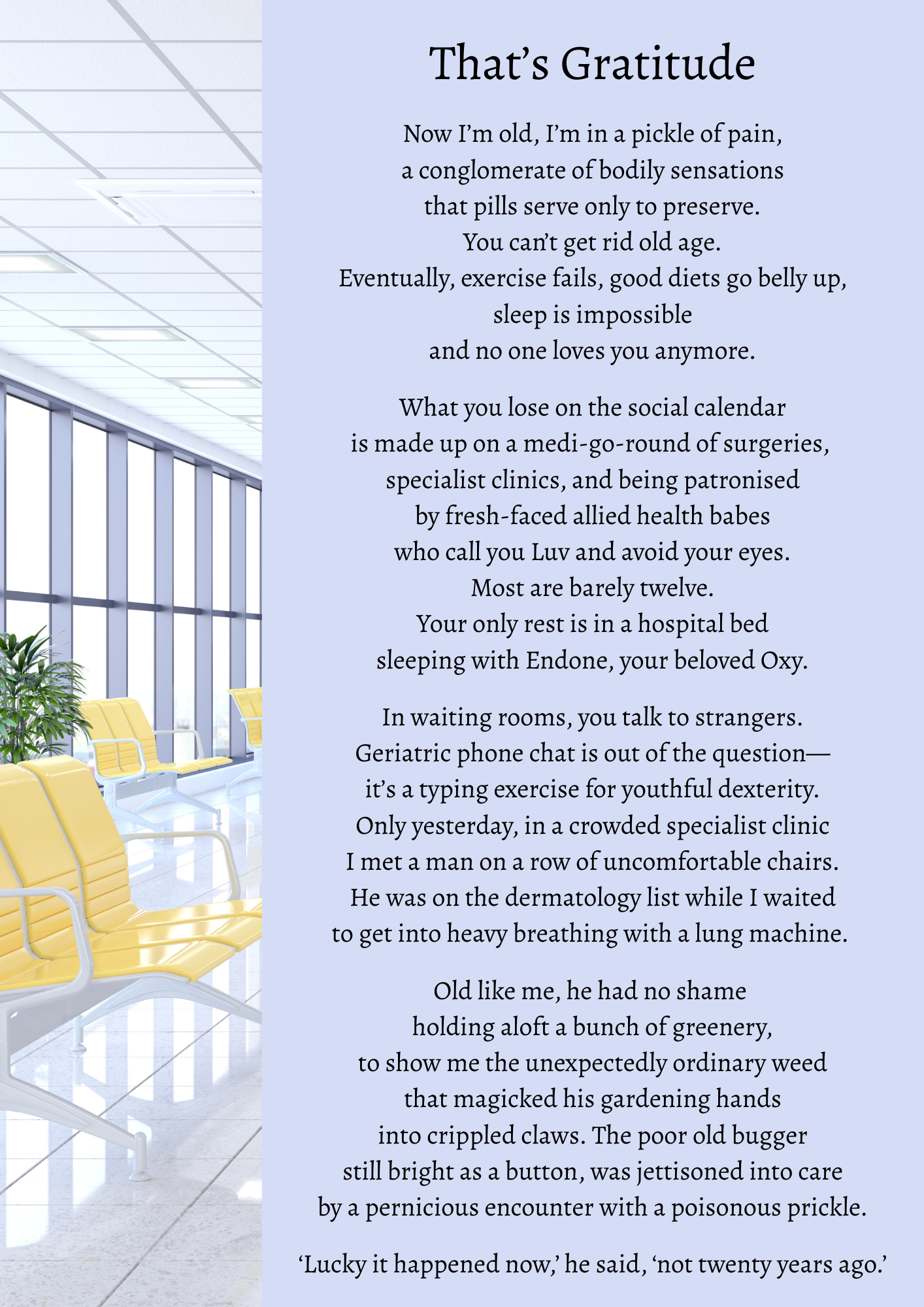 In addition to my health, I’ve written about life events. For example, a poem entitled, ‘What Could Possibly Go Wrong’, emerged from the time when my wife and I were swept out to sea with friends in our kayaks. We had to be rescued by sea rescue and ended up in the news.