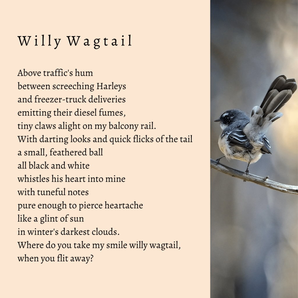 I have just re-read the shocking saga of your spine and all associated nightmares! I couldn’t respond the first time because I was so horrified by everything you have been going through, I hardly had words that seemed equal to the extent of your suffering, or capable of relieving it in any way. I had already admired your stoicism when you were going through the wait and post-op frustrations in relation to your hip. I’ve now decided my new synonym for stoicism is Lindy! Thanks for the willy wagtail poem. Birds are in a class of their own, in my view. There are few things that thrill and inspire me more on a daily basis than the joyous calls of birds, braving all the most difficult conditions thrown at them. Bit like you actually! Thanks for the sage advice about reflecting on those moments when our worlds have been shaken and shattered. Clearly the pain and painkillers didn’t wither your lifetime of collected wisdom, or your capacity to move us with your writing! Look forward to seeing you back with the Tramsenders. Much love, Julie x