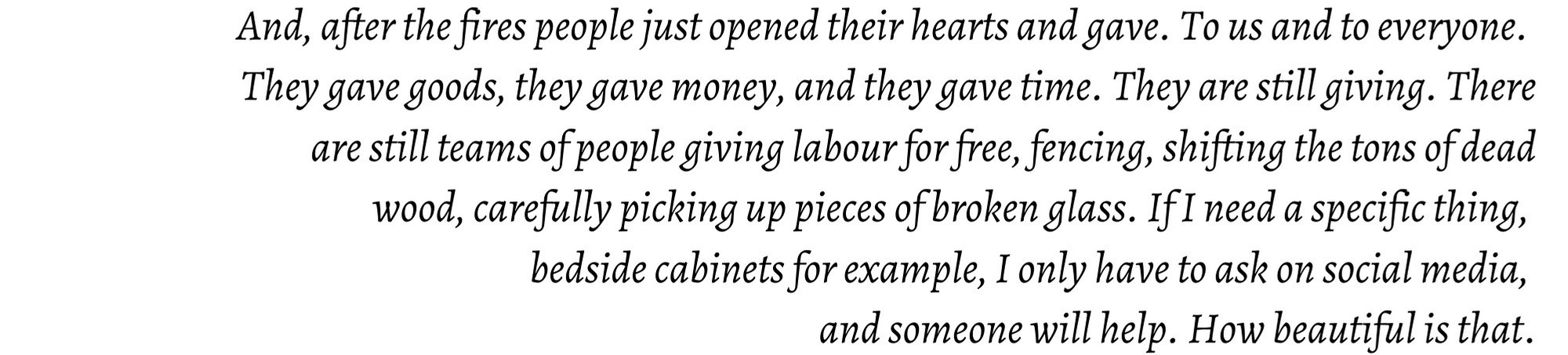 December 20, 2019 is a date that will remain in my memory alongside the dates of loved ones lost. The Cudlee Creek fires started just seven kilometres from us, and we packed a few things and fled. Of course, we thought we would be back the following day. But when we rounded the last hill, we saw that none of our buildings survived. Subsequently, most of the trees died too. All of the fences were gone, all of the tanks and water pipes, everything.