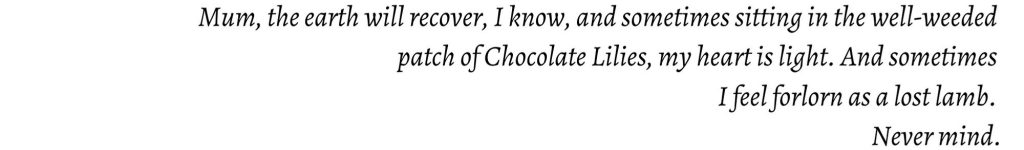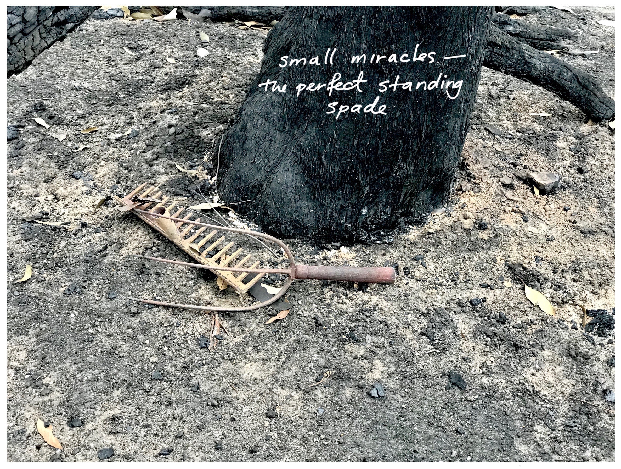 Mostly I am sad about the bush. It is not only decimated, it is desecrated. Sure, life is coming back. There are so many tree seedlings they will have to be viciously thinned. We have a sea of purple chocolate lilies. The air is sweet with them. I have seen only a couple of orchids, but perhaps they will flower in years to come. But of our many stringy barks, only three are shooting in the branches.