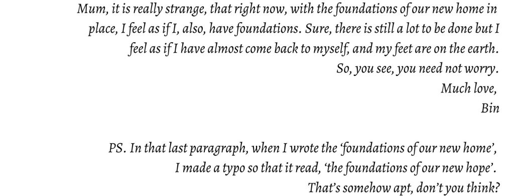 These lovely thoughtful words are the making of a future, while looking at, but not dying from, a frightening past. Hope such as yours is fire-proof, I hope, and you are emerging, phoenix-like for what happens next.
