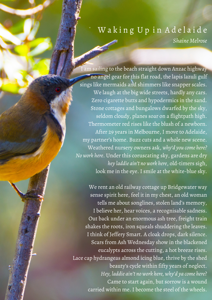 Shaine Melrose is an emerging poet and retired gardener learning to live with chronic illness. Her poems have been published in anthologies, journals and online. Shaine’s poem Seer was highly commended in the 2020 Adelaide Plains Poetry Competition. She was runner-up in the 2018 Goolwa Poetry Cup and finalist in 2019.